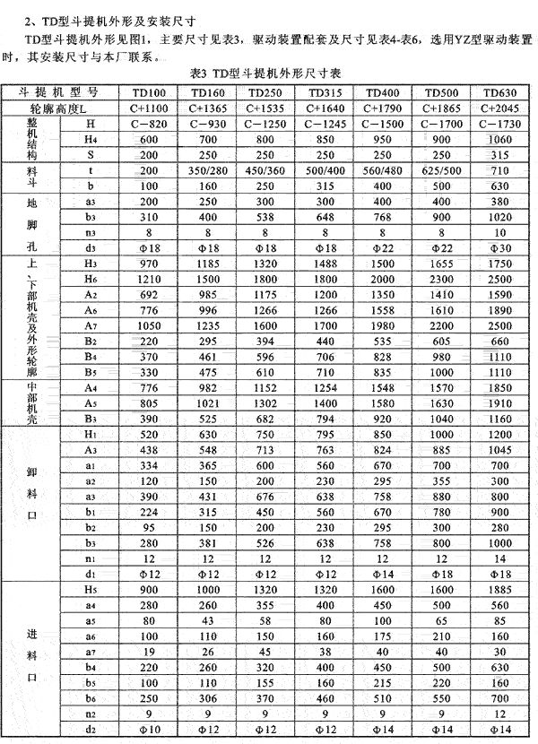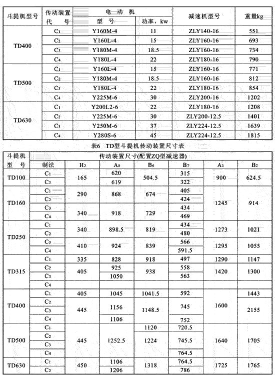 目前國內(nèi)常用的斗提機(jī)均為垂直式,較新型符合標(biāo)準(zhǔn)TB3926--85的有TD型、TH型它們的主要特征、用途及型號見表l