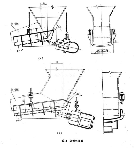 本系列電振機機設計時不考慮倉壓影響,為保證給料機正常運轉,必須盡量減少倉壓對給料機的影響。因此在設計漏嘴時應用漏嘴的后側板承擔料柱的垂直壓力,漏嘴型式及配置尺寸可參考圖14及表8。